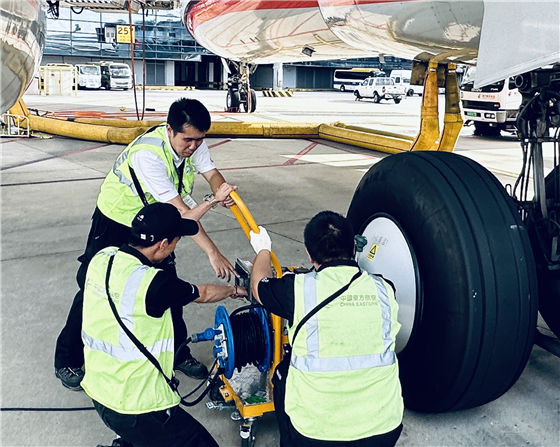 東航機務(wù)正在為一架剛落地的客機機輪通風(fēng)散熱