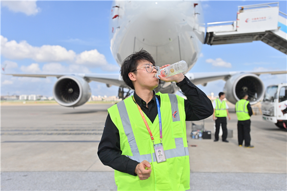 天氣炎熱,機務(wù)們喝水解渴