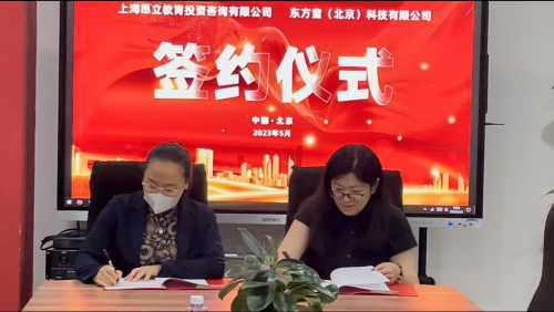 東方童(北京)科技有限公司文化傳媒事業(yè)部總經(jīng)理尹健穎、上海昂立教育投資咨詢有限公司研學(xué)項(xiàng)目負(fù)責(zé)人金玫伶舉行簽約儀式