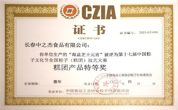2023年4月19日,中之杰再次驚艷亮相中國粽子文化節(jié),一舉斬獲三項全國大獎。中之杰的梅肉黑松露粽作為創(chuàng)新產(chǎn)品,從原料、工藝、口感、顏值等各個方面都受到行業(yè)專家推崇,同時斬獲全國(糕團)技藝大賽雙冠王——大賽最高獎項“粽子產(chǎn)品特等獎”和“粽子產(chǎn)品創(chuàng)新獎”,中之杰海鹽芝士炸不爆元宵榮獲全國(糕團)技藝大賽最高獎項“糕團產(chǎn)品特等獎”。