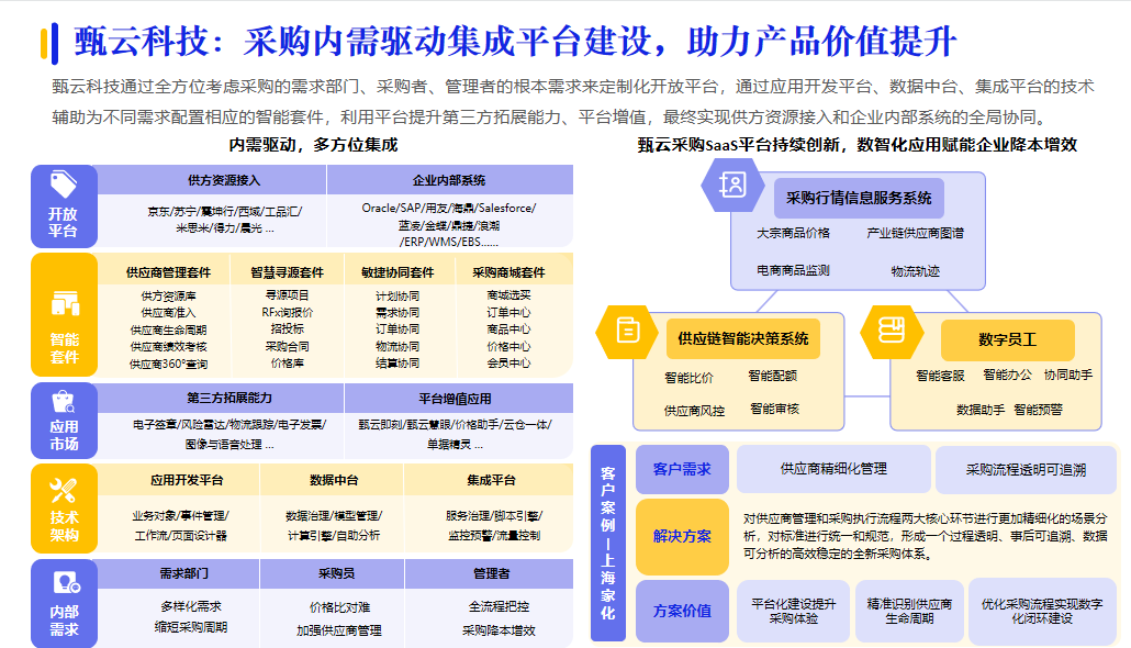 再例如,甄云科技通過全方位考慮采購的需求部門、采購者、管理者的根本需求來定制化開放平臺,實現(xiàn)供方資源接入和企業(yè)內部系統(tǒng)的全局協(xié)同。