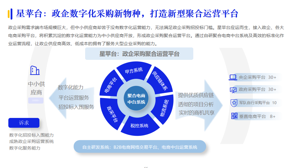 業(yè)務+數(shù)據(jù)的雙中臺模式,也是今年技術服務商在中臺方面的創(chuàng)新看點。從業(yè)務系統(tǒng)獲取的信息經(jīng)過數(shù)據(jù)中臺的處理,再經(jīng)過業(yè)務中臺的分析后,為企業(yè)提供智能決策支持。例如,星蘋臺通過自研聚合電商中臺系統(tǒng),接入政企、各大電商采購平臺,將積累沉淀的數(shù)字化運營能力為中小供應商開放,讓其擁有了服務大型企業(yè)采購的能力。