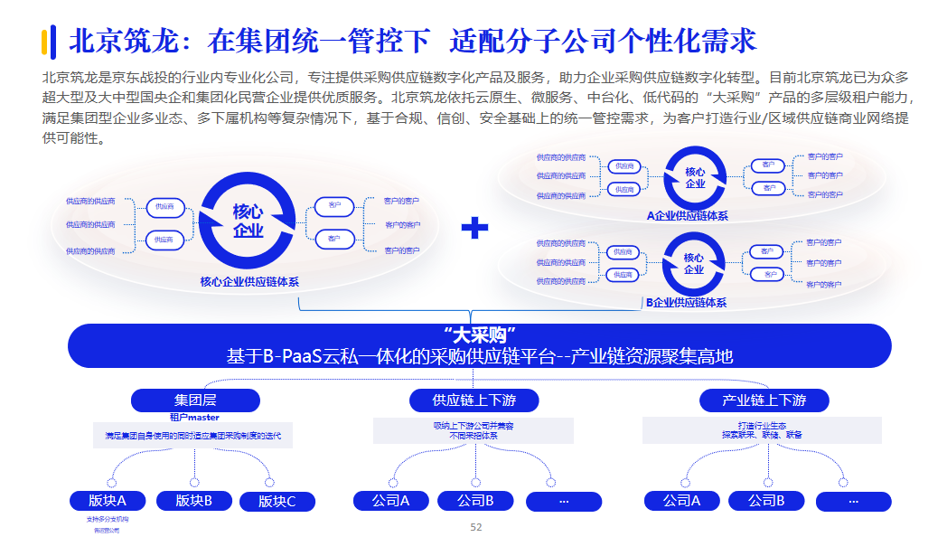 針對企業(yè)既要滿足標準化,又要滿足定制化業(yè)務需求,PaaS提供的服務更具有拓展性、集中性、適配性更強。北京筑龍基于多租戶體系,構建了大采購云私一體化B-PaaS平臺,既滿足多層級集中管理管控需求,又為下屬管理及執(zhí)行機構提供更多個性化、自主性選擇,進而適應集團多元化和業(yè)務單元專業(yè)化發(fā)展。