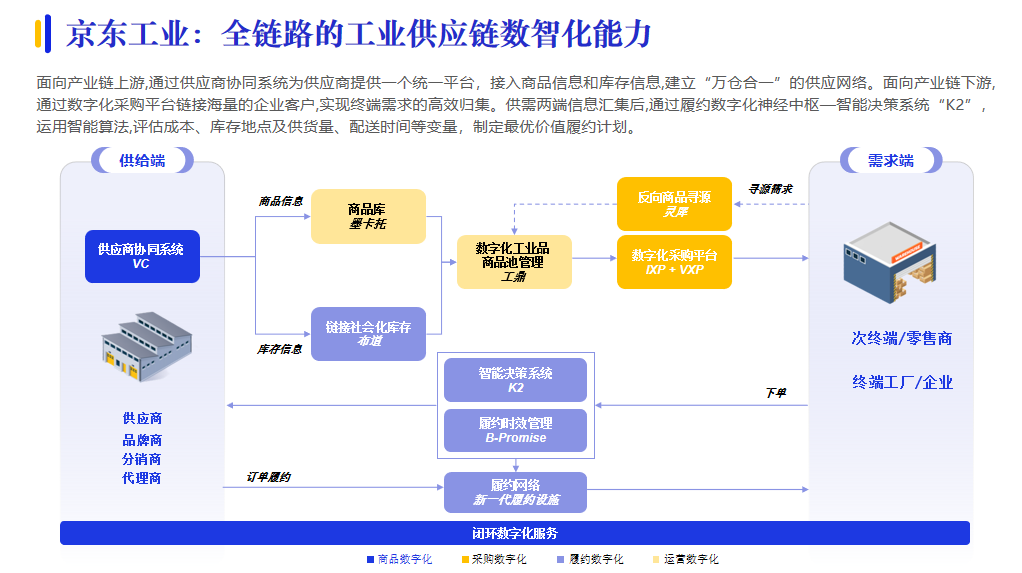 數(shù)字供應鏈發(fā)展已經(jīng)從關注部分環(huán)節(jié)、部分參與者,轉向關注全鏈條、生態(tài),因此,全鏈路數(shù)智供應鏈解決方案漸成主流。例如,京東工業(yè)面向產(chǎn)業(yè)鏈上下游,通過供應商協(xié)同系統(tǒng)建立“萬倉合一”的供應網(wǎng)絡;通過數(shù)字化采購平臺實現(xiàn)終端需求的高效歸集,再通過智能決策系統(tǒng)“K2”,制定最優(yōu)價值履約計劃。