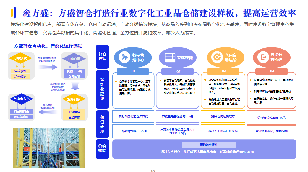 履約能力是供應商的核心競爭力。在履約服務方面,為了提高履約交付效率,供應商加大AI等技術投入應用,建設智能倉儲、智慧物流等數(shù)智供應鏈體系。例如,鑫方盛的方盛智倉打造行業(yè)數(shù)字化工業(yè)品倉儲建設樣板,實現(xiàn)倉庫數(shù)據(jù)的集中化、智能化管理,全方位提升履約效率,減少人力成本。