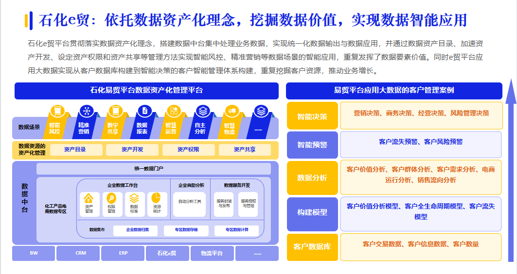 數(shù)字化采購帶來三大供應鏈模式變革:商業(yè)模式、管理模式和服務模式。核心企業(yè)依托資源聚集優(yōu)勢,將其資源整合能力和管理能力向外開放和輸出,提供開放的平臺,實現(xiàn)盈利,引起商業(yè)模式變革;同時,數(shù)據(jù)價值逐漸被釋放,實現(xiàn)數(shù)據(jù)驅動的供應鏈管理模式的變革;例如:石化e貿落實數(shù)據(jù)資產(chǎn)化理念,搭建數(shù)據(jù)中臺集中處理業(yè)務數(shù)據(jù),實現(xiàn)數(shù)據(jù)智能應用。