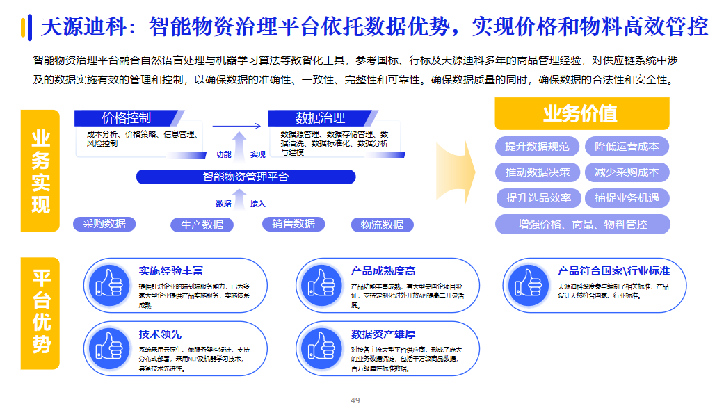 部分央國企會根據(jù)企業(yè)自身的數(shù)字化薄弱點,采取有針對性地補齊斷點的實施策略,包括供建立應商協(xié)同管理系統(tǒng)、優(yōu)化物資分類與編碼設計、建立供應商管理體系、建設電商采購平臺、設計倉儲管理體系等內容。例如:天源迪科在智能物資治理方面,提出了價格和物料高效管控的解決方案,有效確保價格數(shù)據(jù)的合法性和安全性。