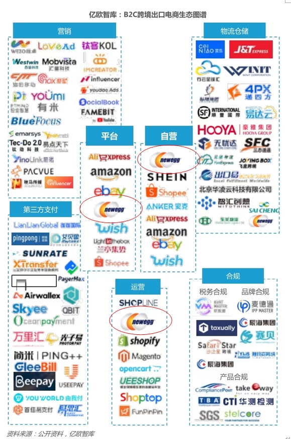 2023年國內(nèi)知名研究機構(gòu)億歐發(fā)布權(quán)威報告,其中談到出口跨境電商的生態(tài)建設(shè)一直處于較為單點部署的狀態(tài),獨立的生態(tài)伙伴解決獨立的問題。構(gòu)建屬于自己的生態(tài)競爭壁壘,需要尋找能夠?qū)⒏鳝h(huán)節(jié)的生態(tài)服務(wù)串聯(lián)起來的媒介,這個媒介就是第三方平臺。如亞馬遜、新蛋 、易貝等第三方平臺,其具有足夠健全完善的生態(tài)服務(wù)體系,覆蓋從建站、營銷、倉儲、物流、運營、支付、供應(yīng)鏈管理各環(huán)節(jié)服務(wù),在注重特殊性、精細化的同時滿足合規(guī)需求;同時依靠平臺的規(guī)模性,能夠形成較好 的議價能力,提供性價比更高、更為可靠的服務(wù)。