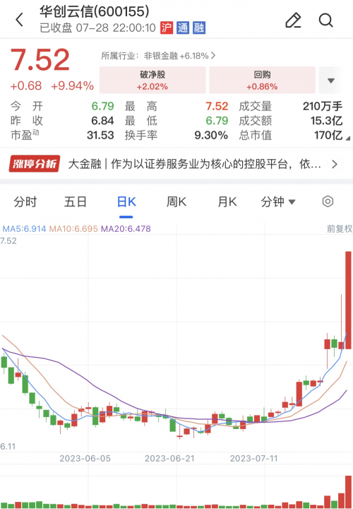 作為太平洋證券7.44億股股權(quán)的收購方,華創(chuàng)證券母公司華創(chuàng)云信(原華創(chuàng)陽安)同樣出現(xiàn)大漲,截至28日收盤,日內(nèi)成交15.28億元,換手率為9.3%,買一封單為9.23萬手,近4個交易日累計(jì)上漲14.81%,最新市值為170.06億元。