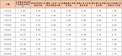 從全國來看,當前國內夏季水果供應較為充足,近期國內水果交易價格整體處于較低水平,本期農(nóng)業(yè)農(nóng)村部監(jiān)測的6種重點監(jiān)測水果價格跌幅收窄。截至7月31日,農(nóng)業(yè)農(nóng)村部監(jiān)測的6種水果(富士蘋果、巨峰葡萄、香蕉、菠蘿、西瓜、鴨梨)批發(fā)均價報7.35元/公斤,較7月24日下跌0.94%。