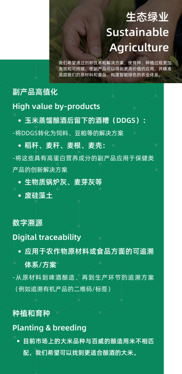 每一年,100+創(chuàng)新中心都會在價值鏈上梳理亟待解決的可持續(xù)發(fā)展挑戰(zhàn)議題并公開招募創(chuàng)新解決方案,目標(biāo)是讓你的想法得到驗證并實現(xiàn)商業(yè)化應(yīng)用,在試點完成后能夠獲得更大的商業(yè)合同,與百威中國以及更多伙伴建立強(qiáng)有力的合作。