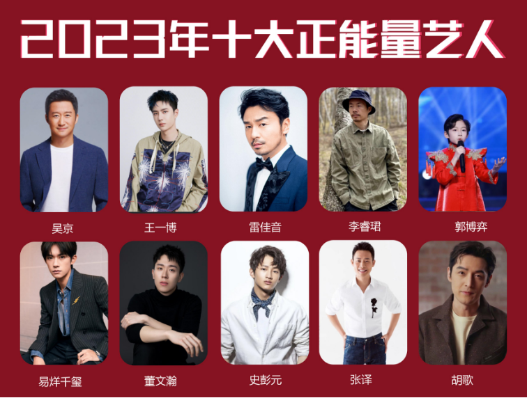 7月31日,由網(wǎng)友評(píng)選的2023年十大正能量藝人排行榜揭曉,吳京、王一博、雷佳音、李?,B、郭博弈、易烊千璽、董文瀚、史彭元、張譯、胡歌等10人最終入選。