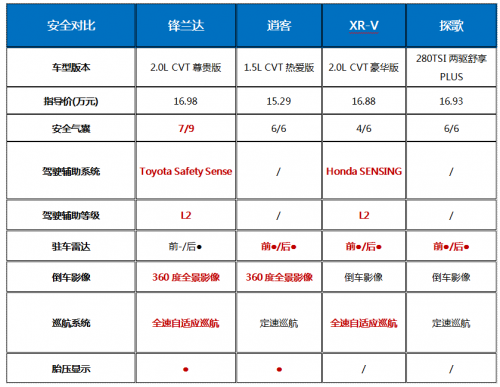 而在主動安全配置上,四款車型中僅有2款提供了選擇,分別為鋒蘭達搭載的T-PILOT智能駕駛輔助,以及XR-V的Honda SENSING駕駛輔助系統(tǒng),兩車的功能性方面均滿足L2級的自動駕駛。并且兩車的主動安全都近乎實現(xiàn)全系標配,這也讓購車的消費者不用過多在主動安全以及更高的預算上左右為難。