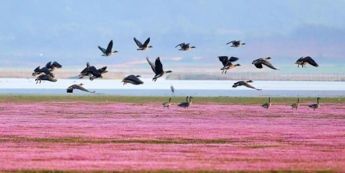 遠(yuǎn)山晚霞鋪滿天際,一群飛鳥掠過夢幻花海,空氣中漂浮著沁人心脾的甜香……作為鄱陽湖地區(qū)候鳥遷徙的第一站,馬影湖美得仿佛仙境落到了人間。