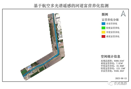 水體富營養(yǎng)化是指水中營養(yǎng)物質(zhì)(如氮、磷)過度積累,導(dǎo)致水體中藻類、水生植物大量繁殖的現(xiàn)象。水體富營養(yǎng)化會(huì)造成藻類過度生長,破壞水生態(tài)系統(tǒng)的平衡,甚至引發(fā)水體死亡。通過無人機(jī)多光譜遙感技術(shù),結(jié)合實(shí)測水質(zhì)參數(shù)數(shù)據(jù)的分析,對本次實(shí)驗(yàn)河道水體富營養(yǎng)化的識別情況如圖4所示。