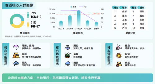 帳篷賽道解讀:該賽道抖音2022年搜索量同比增長228.6%,遠(yuǎn)高于行業(yè)整體水平。該賽道的興趣群體以 31-40 歲的男性為主,主要分布地區(qū)涵蓋多個熱門旅游城市。隨著生活水平的提高和對自然休閑需求的增加,多功能帳篷在未來將更受歡迎,防雨、美觀和防風(fēng)等多重特性將滿足人們對于舒適和便利的需求。除此之外,在技術(shù)創(chuàng)新、多樣化產(chǎn)品、個性化定制、環(huán)??沙掷m(xù)發(fā)展等趨勢上,這一領(lǐng)域?qū)⒂袕V闊的市場前景。