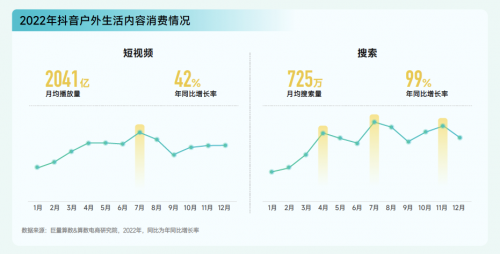 2022年戶外生活相關(guān)內(nèi)容在抖音上的受歡迎程度持續(xù)增長,月均播放量高達(dá) 2041 億次,同比增長 42%。除短視頻種草外,用戶主動搜索戶外生活內(nèi)容的意愿也更加強(qiáng)烈,月均搜索量達(dá)到 725 萬次,同比增長 99%。