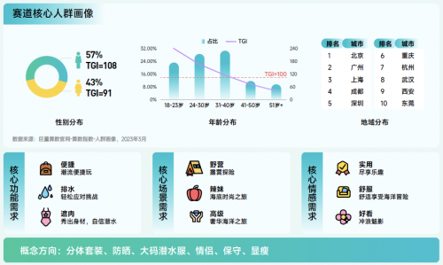沖浪賽道解讀:2022年搜索量同比增長100.7% 。用戶以男性為主,集中在北上廣一線城市。24-40 歲人群對沖浪潛水更感興趣。相對來說,對于沖浪潛水用戶更注重便捷、排水等功能。未來,隨著技術(shù)的發(fā)展和人們對海洋環(huán)境保護(hù)意識的增強(qiáng),沖浪運(yùn)動將更加注重舒適、安全和環(huán)保,并可能推出更具創(chuàng)新性的裝備,產(chǎn)生新的活動形式。