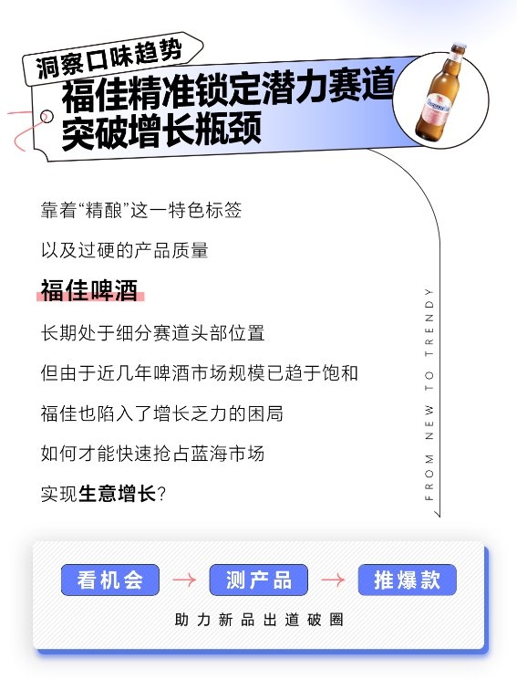 福佳啤酒在巨量云圖“新品推爆”全能力的加持下,通過商品多維度洞察快速了解市場趨勢,并利用「新品實驗室」進行敏捷、準確地測品,有效降低上新試錯成本,精準定位潛力貨品、高價值人群以及營銷場景,在實現(xiàn)短期生意增量爆發(fā)的同時,也為品牌在抖音平臺長效經(jīng)營累積了人群資產(chǎn)。