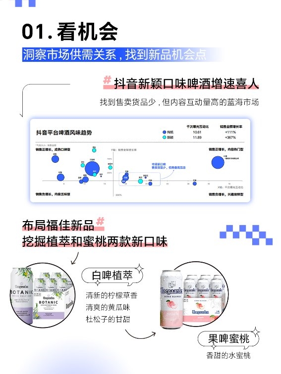 基于巨量云圖商品洞察能力,福佳對抖音啤酒大盤現(xiàn)狀及細分賽道趨勢進行分析,發(fā)現(xiàn)抖音啤酒細分類目均正增長,其中白啤增長最可觀,果啤趨向高客單商品。進一步洞察抖音啤酒風味趨勢發(fā)現(xiàn),新穎口味啤酒增速喜人,黃瓜和桃子兩種口味受抖音消費者關注,但市場的針對性供給較少,蘊含巨大的發(fā)展?jié)摿?這恰巧與福佳現(xiàn)有產(chǎn)品組合高度匹配。