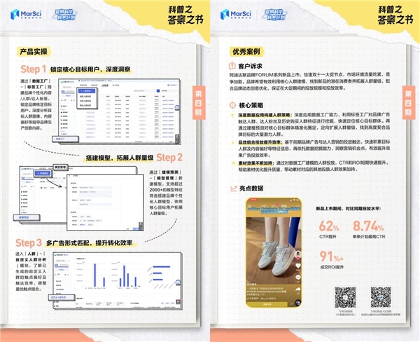 本期的「科普之答案之書」正是以服飾行業(yè)的新品上市營銷節(jié)點為例,品牌結(jié)合“數(shù)據(jù)工廠”中的“標簽工廠”“建模預測”等能力,通過“一鎖定、二擴展、三提效”的經(jīng)營策略,在雙十一大促節(jié)點準確找到了新品核心用戶和潛在消費者,同時配合品牌動態(tài)創(chuàng)意優(yōu)化,保證在大促期間的投放規(guī)模和投放效率,最終實現(xiàn)了CTR與ROI的大幅度提升。