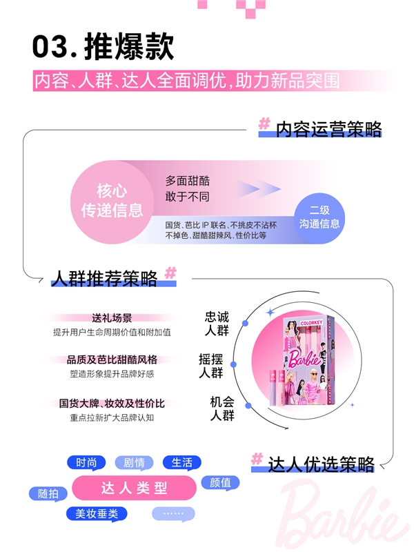 2、分關(guān)系人群:針對忠誠人群強調(diào)送禮場景,針對搖擺人群強調(diào)品質(zhì)及芭比風格,針對機會人群強調(diào)妝效及性價比。