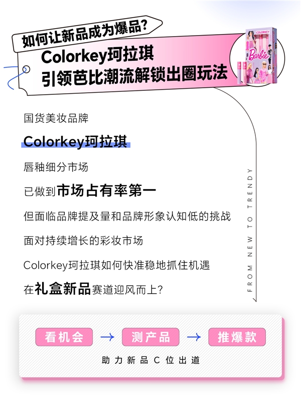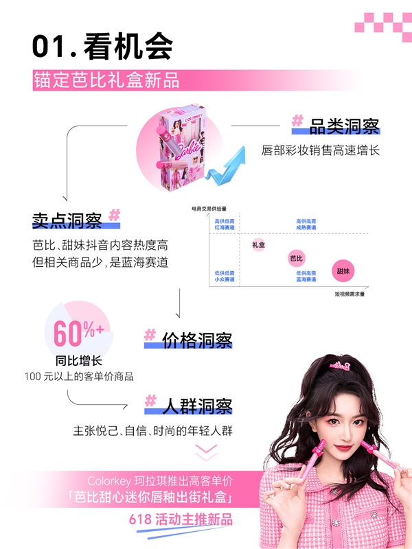 適用于送禮、提升品牌調(diào)性、具有高客單價特征的“芭比禮盒”新品,符合品牌風格特點和消費需求,適宜作為品牌形象款進行主推和破圈。基于此,珂拉琪打造高客單價“芭比甜心迷你唇釉出街禮盒”作為618活動的主推新品,強力吸引目標人群。