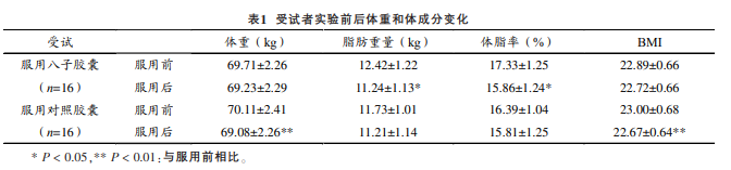 國(guó)家體育總局運(yùn)動(dòng)醫(yī)學(xué)研究所的一項(xiàng)針對(duì)男子足球運(yùn)動(dòng)員賽前準(zhǔn)備期和比賽期血液生化指標(biāo)和運(yùn)動(dòng)能力的研究表明,服用八子補(bǔ)腎膠囊受試者實(shí)驗(yàn)后,脂肪重量和體脂率較實(shí)驗(yàn)前明顯降低[3](見(jiàn)表1)。