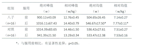 在減少脂肪含量的同時(shí),還要注意增加肌肉量。這里要關(guān)注一個(gè)指標(biāo),無(wú)氧運(yùn)動(dòng)能力。無(wú)氧運(yùn)動(dòng)能力是人體基本運(yùn)動(dòng)能力之一,主要反映機(jī)體骨骼肌在不同運(yùn)動(dòng)階段短時(shí)快速激烈運(yùn)動(dòng)的一種運(yùn)動(dòng)能力。來(lái)自國(guó)家運(yùn)動(dòng)營(yíng)養(yǎng)測(cè)試研究中心的一項(xiàng)實(shí)驗(yàn)報(bào)告表明,服用“八子補(bǔ)腎膠囊”后運(yùn)動(dòng)員的無(wú)氧功率平均值和相對(duì)無(wú)氧功率平均值明顯升高,說(shuō)明“八子補(bǔ)腎膠囊”可以提高無(wú)氧運(yùn)動(dòng)能力[6](見(jiàn)表2)。