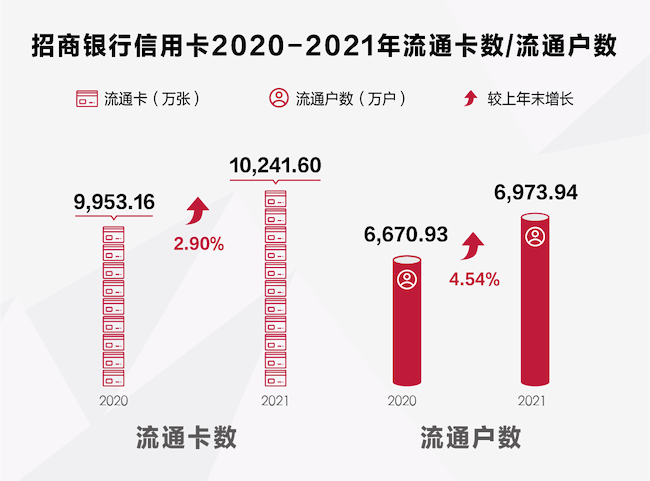 據(jù)財(cái)報(bào),截至2021年底,招行信用卡流通卡量10241.6萬張,較上年末增長2.9%,首次突破1億張;流通戶數(shù)6973.94萬戶,較上年末增長4.54%。招行信用卡流通卡量、流通戶數(shù)在高位穩(wěn)步增長,與其從客戶視角出發(fā)推動(dòng)產(chǎn)品升級(jí),完善豐富的產(chǎn)品矩陣不無關(guān)系。