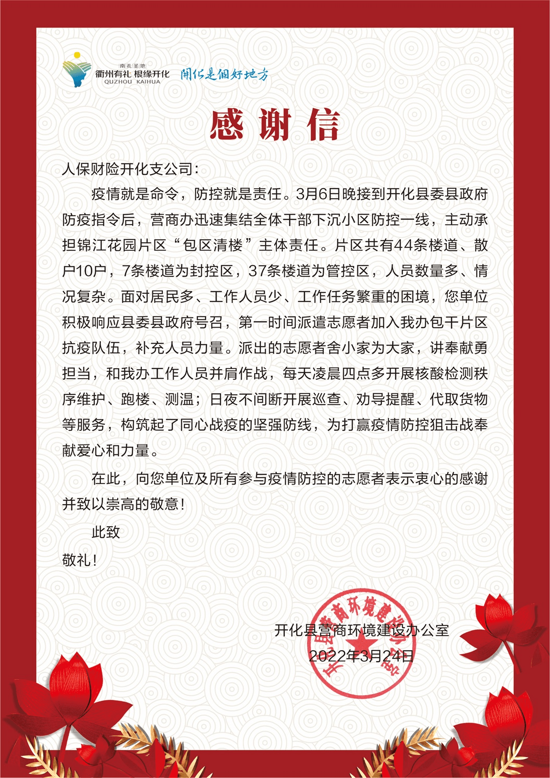 開化縣營商環(huán)境建設(shè)辦公室為開化人保財(cái)險(xiǎn)支持抗疫送上的感謝信。