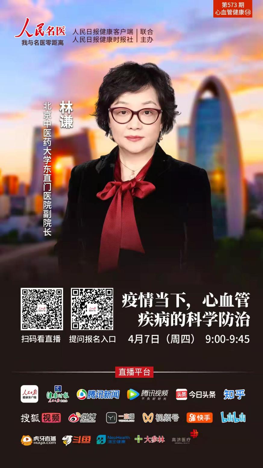 4月7日上午9:00~9:45,以嶺藥業(yè)聯(lián)合人民日報健康客戶端策劃的世界健康日直播訪談節(jié)目《疫情當下,心腦血管疾病的科學防治》,特別邀請到北京中醫(yī)藥大學東直門醫(yī)院副院長林謙為大家進行權威解答!
