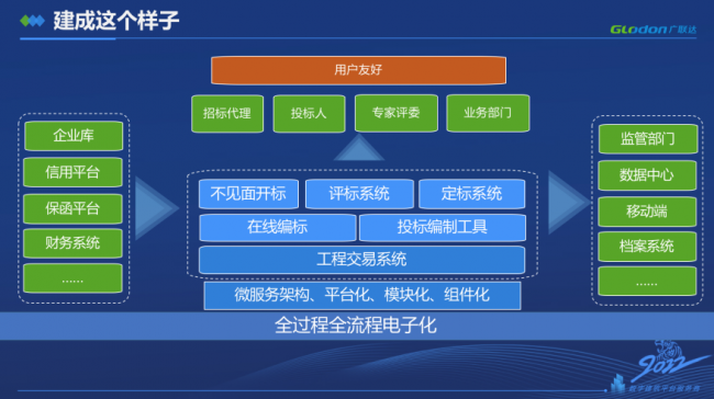 針對以上問題和挑戰(zhàn),并結合客戶對靈活性的高度要求,廣聯(lián)達依托自身在工程建設及公共資源交易領域的實踐經(jīng)驗,梳理了一套具有廣州特色建設工程交易解決方案。方案采用微服務架構,具有可拓展、平臺化、組件化和模塊化等特性,從全面、靈活、智能和創(chuàng)新四個方面,助力廣州交易集團重構建設工程交易系統(tǒng),優(yōu)化建設工程招投標體驗。