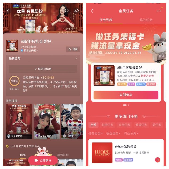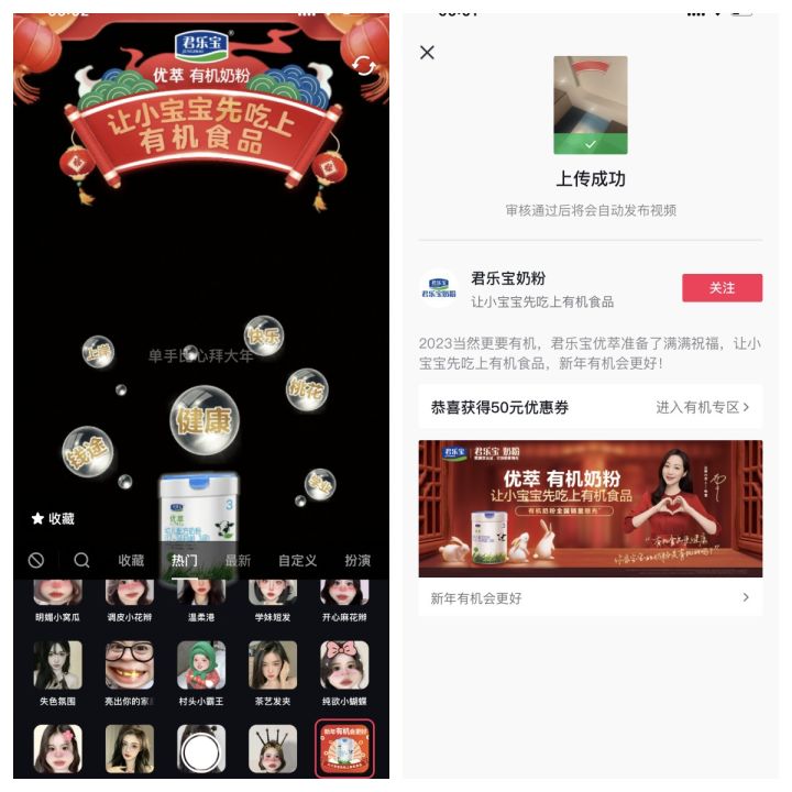 基于新一代母嬰人群所追求沉浸感和參與感,信賴場景式安利、沉浸式感受,因而優(yōu)萃有機(jī)奶粉攜手巨量引擎在基礎(chǔ)品牌信息的純曝光宣傳之外,共創(chuàng)了一系列多元互動玩法,如找紅包、集節(jié)氣卡、挑戰(zhàn)賽貼紙等,在點(diǎn)燃新春氛圍的同時(shí)加深了品牌與用戶深度互動,尤其是在抖音上發(fā)起的 #新年有機(jī)會更好 的話題挑戰(zhàn)賽,優(yōu)萃有機(jī)奶粉的有機(jī)賣點(diǎn)持續(xù)多次露出,活動各頁面上“優(yōu)萃有機(jī)奶粉,讓小寶寶先吃上有機(jī)食品”高度吸睛,最大程度覆蓋了用戶的目光所及之處,高密度投放且集中化曝光使得優(yōu)萃有機(jī)奶粉品牌價(jià)值理念在用戶心智中形成深刻記憶點(diǎn)。