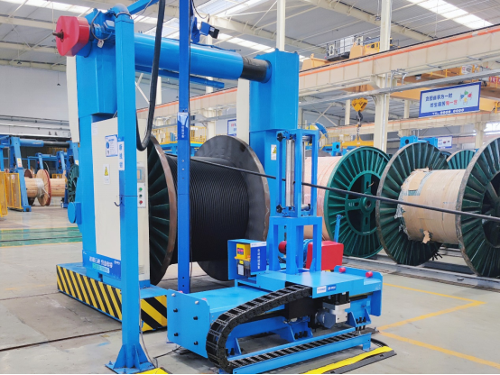藍(lán)色自行小車(chē)把巨大的電纜軸送到既定位置,黃色的機(jī)械臂將線軸卡好,設(shè)備啟動(dòng)后線纜開(kāi)始自動(dòng)纏繞,一盤(pán)整齊的電纜線慢慢成型。車(chē)間里,紅、黃、藍(lán)、白色的機(jī)械臂、自行小車(chē)等機(jī)械設(shè)備分工合作,有條不紊地生產(chǎn)。諾大的廠房中,零星行走著幾位身著藍(lán)色工裝、頭戴安全帽的工作人員。