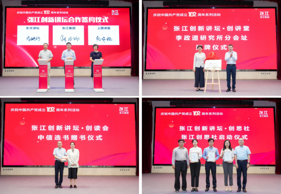 張江創(chuàng)新講壇合作簽約儀式(左上)、李政道研究所分會址揭牌(右上)、中信選書贈書儀式(左下)、張江創(chuàng)思社啟動儀式(右下)