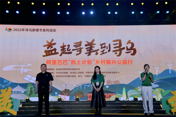 客家韻、紅土風(fēng)、東江源、橘鄉(xiāng)情,尋烏不尋常!11月21日晚,2022年尋烏臍橙節(jié)系列活動之阿里巴巴“熱土計劃”鄉(xiāng)村振興公益行—益起尋美到尋烏系列活動,在江西省尋烏縣客家小鎮(zhèn)音樂噴泉廣場盛大舉行。本次活動由農(nóng)業(yè)農(nóng)村部市場與信息化司指導(dǎo),中共尋烏縣委、尋烏縣人民政府、阿里巴巴公益、中國農(nóng)業(yè)電影電視中心主辦;阿里巴巴鄉(xiāng)村振興基金、盒馬、飛豬旅行、《鄉(xiāng)約》欄目共同承辦。