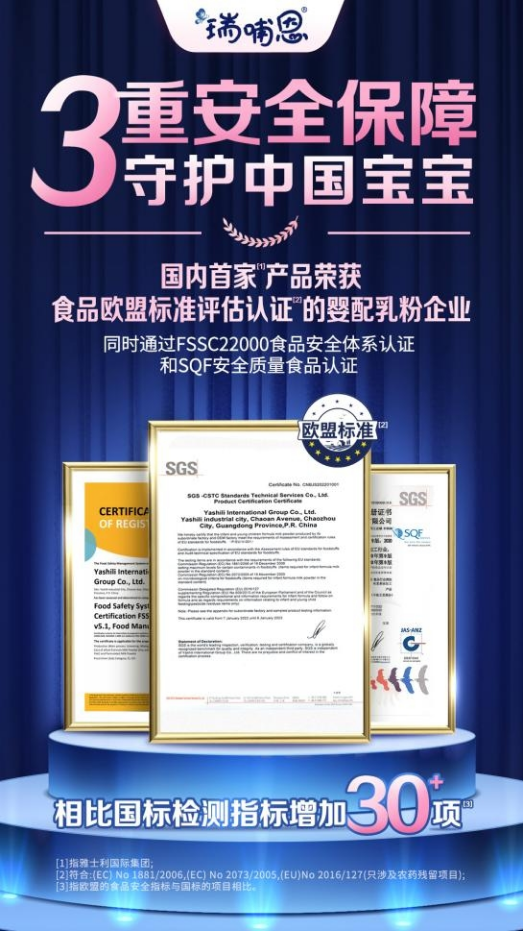 作為乳業(yè)領(lǐng)軍企業(yè),雅士利國際的質(zhì)量文化建設(shè)一直走在行業(yè)前沿,也由此獲得業(yè)內(nèi)多項(xiàng)認(rèn)可,榮獲國際權(quán)威認(rèn)證機(jī)構(gòu)SGS授予的嬰幼兒配方食品歐盟標(biāo)準(zhǔn)評(píng)估認(rèn)證的產(chǎn)品認(rèn)證證書,成為國內(nèi)首家產(chǎn)品榮獲食品歐盟標(biāo)準(zhǔn)評(píng)估認(rèn)證的嬰配粉乳粉企業(yè),同時(shí)還獲得FSSC22000食品安全體系認(rèn)證和SQF食品安全質(zhì)量認(rèn)證。