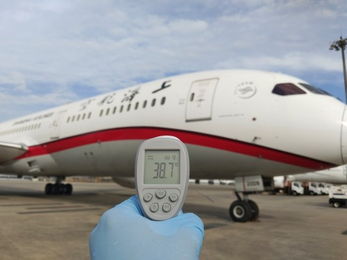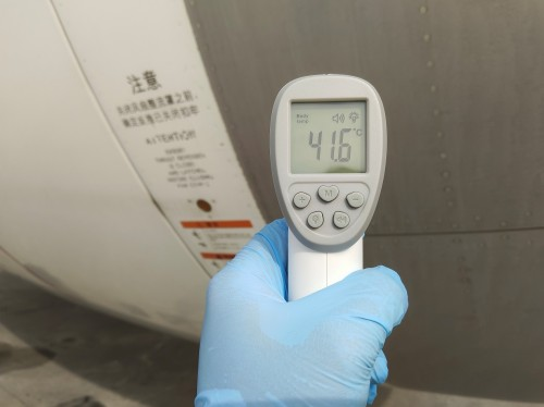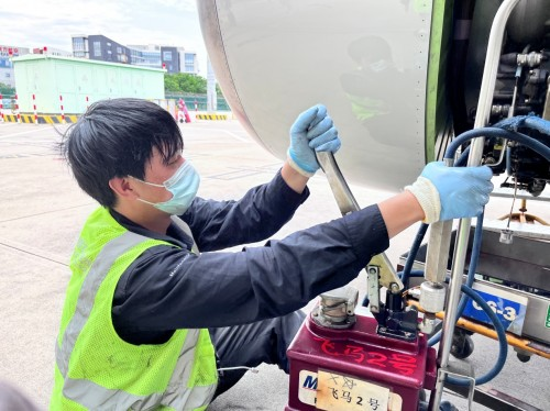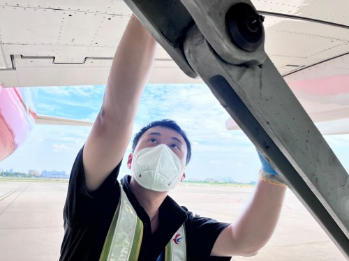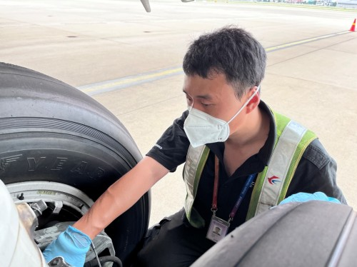 擦拭飛機(jī)起落架鏡面是航線保障中很尋常的一項工作,但由于今天外部氣溫較高,吸油棉接觸飛機(jī)鏡面后,東航機(jī)務(wù)員工的手心瞬間感覺炙熱