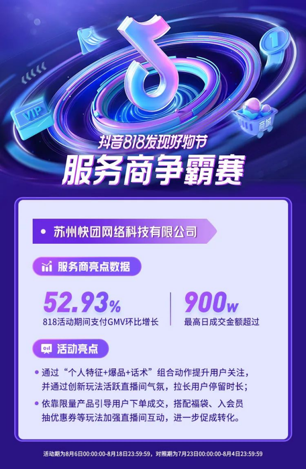 其一,正如在本次活動(dòng)中,服務(wù)商們用足抖音818大促的消費(fèi)氣氛,不錯(cuò)過(guò)每一個(gè)重大平臺(tái)活動(dòng),與平臺(tái)活動(dòng)充分聯(lián)動(dòng),已成為行業(yè)共識(shí)。在抖音818發(fā)現(xiàn)好物節(jié)期間,一系列大促活動(dòng),為服務(wù)商們提供了與用戶對(duì)話的工具;同時(shí),我們也看見(jiàn),許多服務(wù)商以“大促”為試金石,抓住消費(fèi)氛圍,在直播間內(nèi)延伸出自己獨(dú)特的大促玩法、進(jìn)一步優(yōu)化了運(yùn)營(yíng)技巧。內(nèi)容場(chǎng)、中心場(chǎng)和營(yíng)銷場(chǎng)三大增長(zhǎng)場(chǎng)相互配合、共同發(fā)力,一種平臺(tái)、商家、服務(wù)商價(jià)值一致、良性對(duì)流的生態(tài),正在被建立起來(lái)。