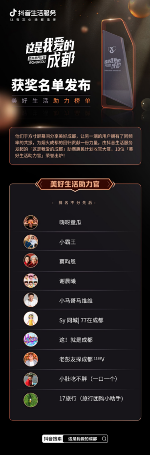 2022年11月4日,由抖音生活服務(wù)發(fā)起的「這是我愛的成都」助商惠民計劃收官大賞,以一場「這是我愛的成都·美好生活助力榜單」榮譽發(fā)布,對活動期間為成都播撒生活美好的30個品牌和10位達人做出總結(jié)與嘉獎。