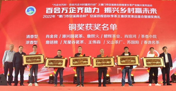 安溪縣人民政府副縣長洪天陽和廈門市安溪商會會長鐘江波頒發(fā)清香型優(yōu)質(zhì)獎牌匾和證書