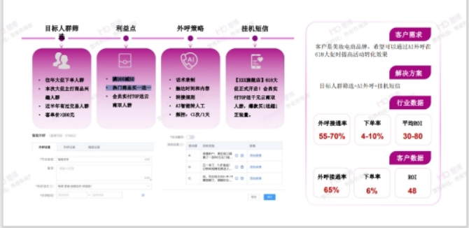 例如,今年618期間,慧博科技某美妝品牌客戶(hù),基于慧博慧博云千載數(shù)據(jù)中臺(tái)監(jiān)測(cè)到最近上的新品下單的趨勢(shì)增強(qiáng),基于該部分興趣人群的篩選,通過(guò)618這個(gè)大促契機(jī),以“滿(mǎn)300減50 熱門(mén)商品買(mǎi)一送一”等利益點(diǎn)進(jìn)行智能AI外呼觸達(dá)+掛機(jī)短信提醒,下單率提升6%。