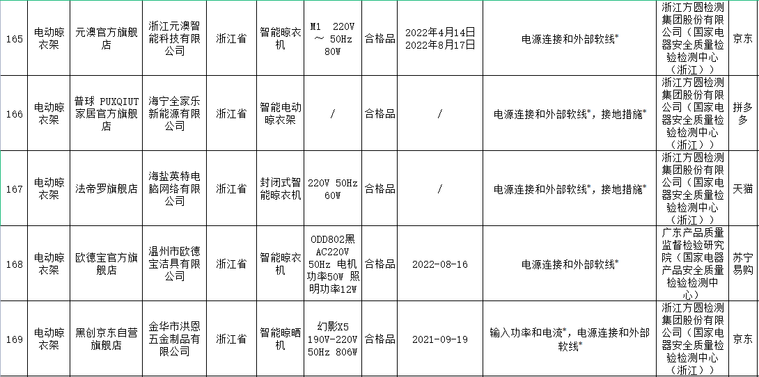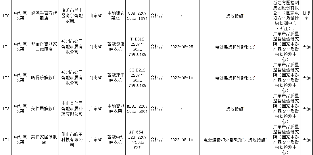 本次電動晾衣架抽查檢驗9個省(市)48家企業(yè)生產(chǎn)的52批次產(chǎn)品,包括天貓、京東、拼多多、抖音等電子商務平臺,發(fā)現(xiàn)24批次產(chǎn)品不合格,涉及卡瑞琪(courage)、顧家、格峰、盼盼、歐蘭特等品牌。