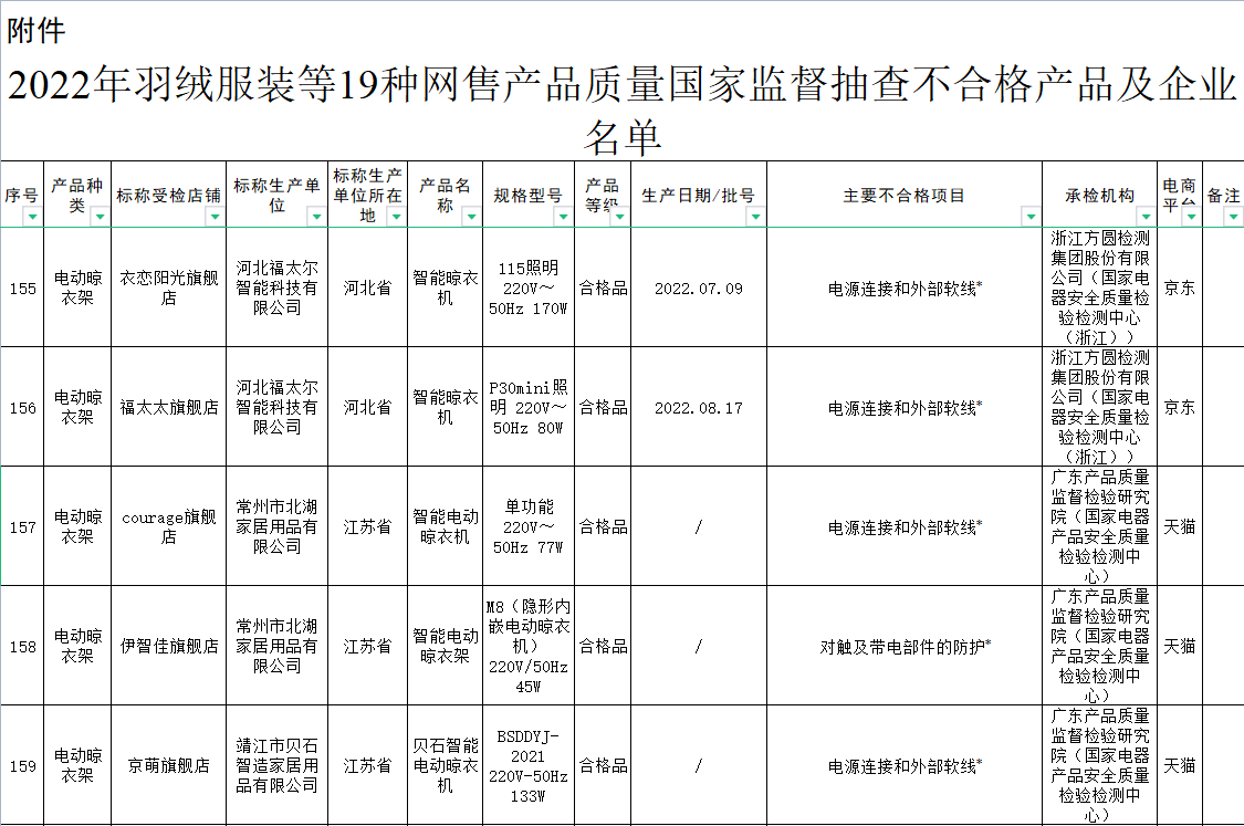 近日,市場監(jiān)管總局通報了2022年羽絨服、電動晾衣架等19種網(wǎng)售產(chǎn)品質量國家監(jiān)督抽查情況。結果顯示,2022年度電動晾衣架抽查不合格率高達46.2%,為19種抽查產(chǎn)品中最高。